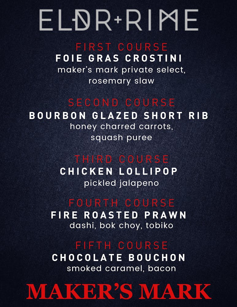Embark on a refined culinary experience with our Maker's Mark Dinner at Eldr+Rime. Menu crafted by Chefs David Cook and Jose Gonzalez, this five-course menu highlights the distinct flavors of Maker's Mark and explores how oak can be used to infuse new flavors to food. Each course will be paired by a different expression of Maker's Mark, highlighted by our private bottling; Maker's Mark E+R No. 5. This dinner is offered at $95 per person with options to purchase additional Maker's Mark offerings.